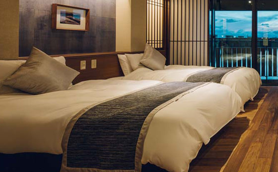 京都一の繁華街、四条河原町からほど近い路地に佇む京町家スタイルの旅館は、暖簾をくぐると黒松の盆栽と艶やかな日本画がお出迎えしてくれます。町家ならではの吊り床のしつらえと畳の香りが感じられる和心伝わる9部屋は、まるで京都の実家のよう。2年前に楽遊、堀川五条様オープン時に館内着を納品させて頂いたご縁があり、姉妹店オープンにあたっても館内着と座布団、座布団カバーのご注文を賜りました。